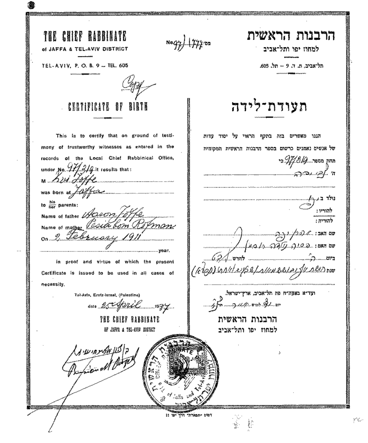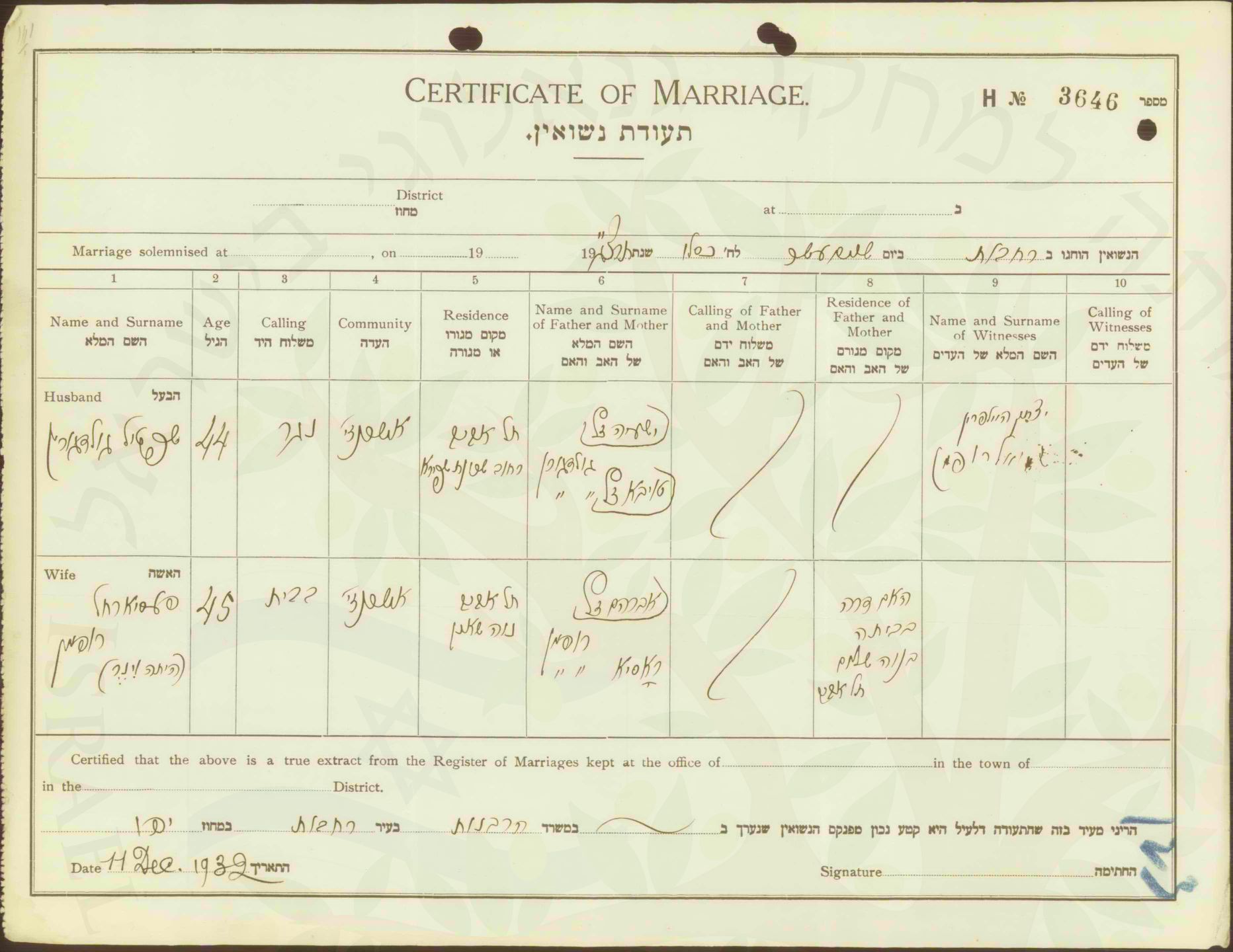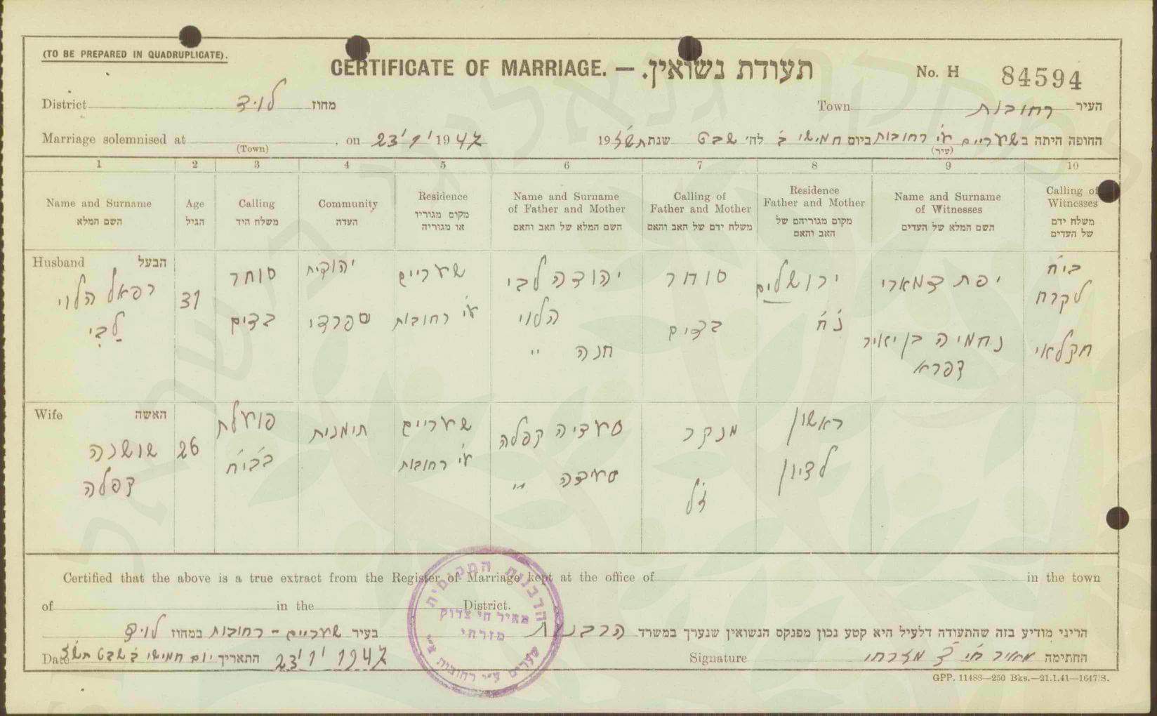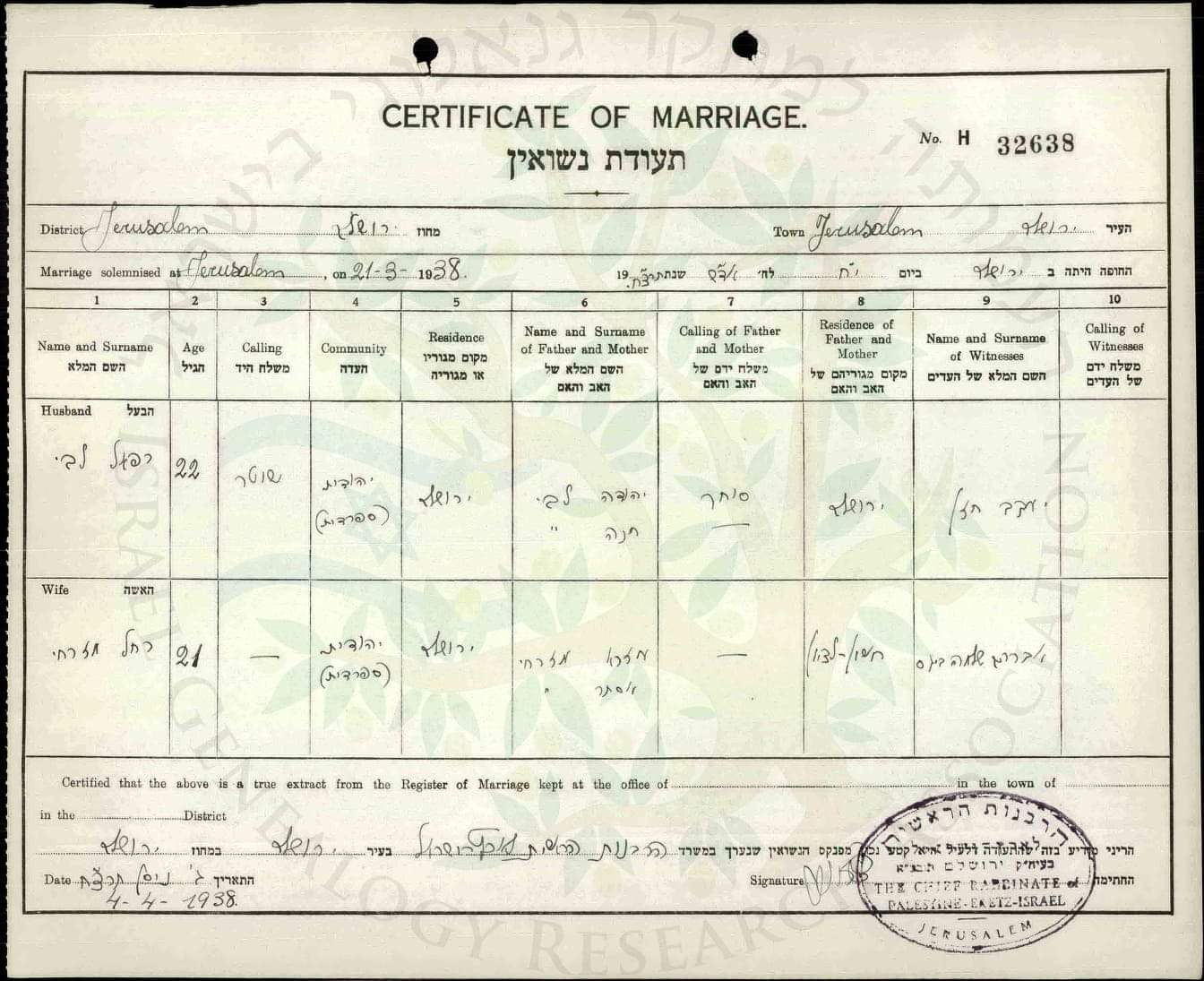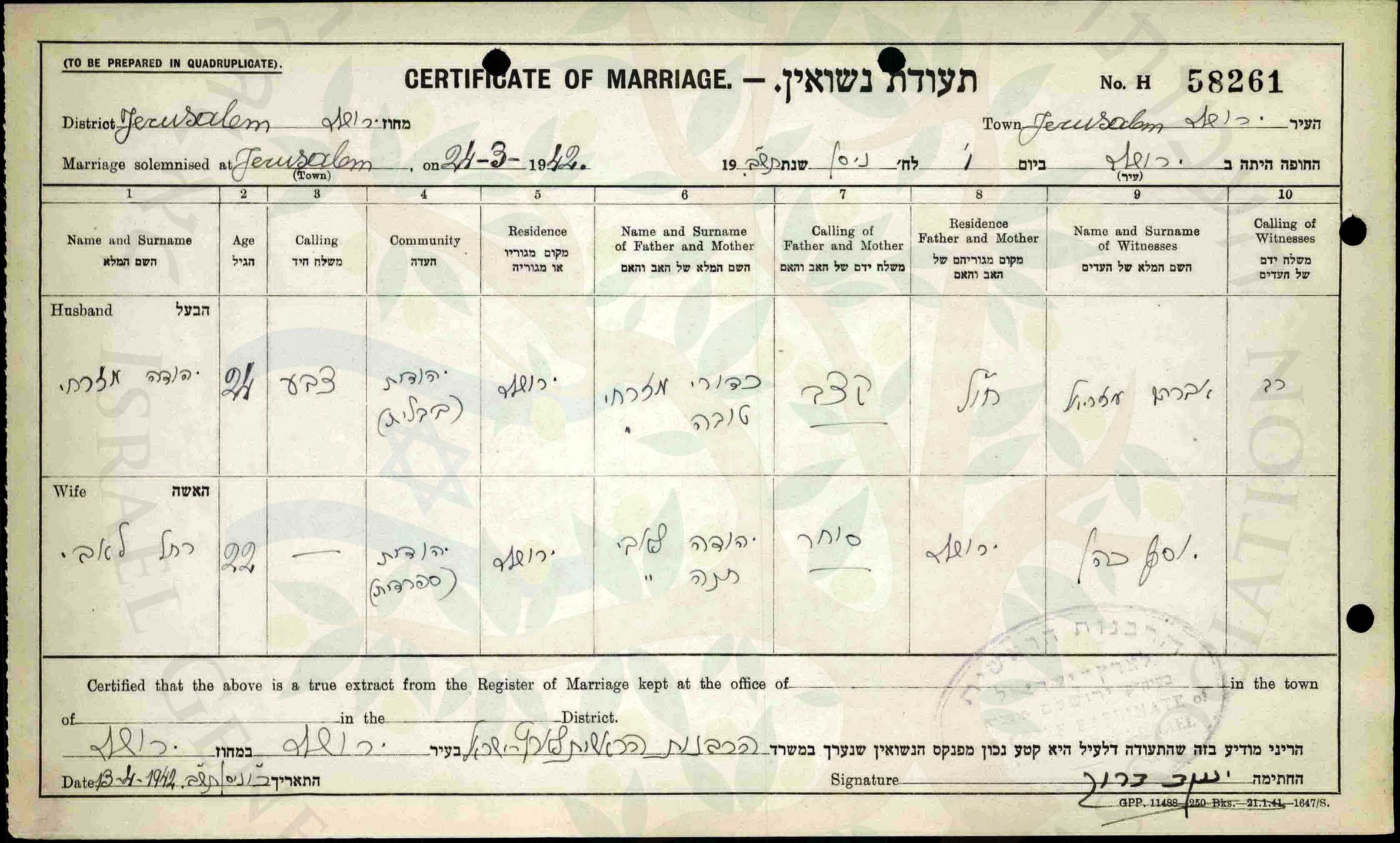 תעודת נישואין של יהודה מזרחי (לימים עוזר) עם רחל לאבי, משנת 1942 |