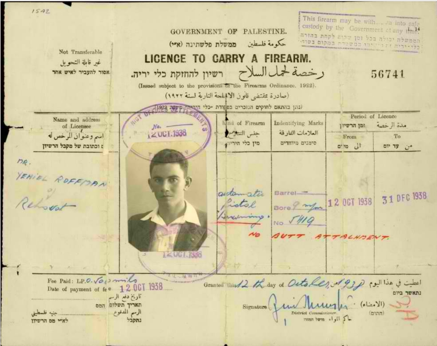 רישיון להחזקת כלי יריה אשר ניתן ליחיאל רופמן בשנת 1938 |