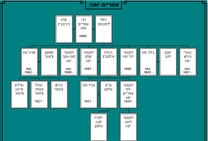 אפריים יופה נולד בשנת 1865 בחברון, להוריו רבי צבי-הירש וצארנה-פייגה יופה. בשנת 1881 בהיותו בגיל 16 שנים נישא אפריים יופה לעדה רבינוביץ' בחברון, אולם לשניים לא נולדו ילדים. בשנת 1887 ,בהיותו בן 22 נשא אפריים יופה לאישה את רחל ליפבסקי בירושלים, ולהם נולדו הילדים: שרה, חנה (לימים אנני), יצחק, דוד, בלה, והירש (לימים הארי). לצפייה בתרשים צאצאיו של אפריים יופה לחץ כאן . בשנת 1902 היגרו אפריים ורחל יופה יחד עם ילדיהם לאוסטרליה, והתיישבו בויקטוריה. בתחילה, עבד אפריים יופה כמוכר פירות, אך כשחסך די כסף הקים מפעל, וניהל אותו. שיפור זה במצבו הכלכלי איפשר לאפריים יופה לשלוח רבים מילדיו (דוד,יצחק,חנה) ללימודי רפואה. אפריים יופה נפטר ב- 26/8/1938 בבית החולים סנט בנדיקטס, באוסטרליה, בהיותו בן 74 שנים. |