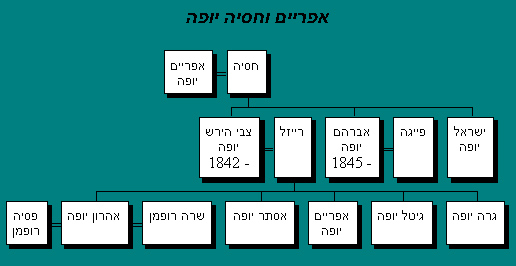 רבי דוד יפה ורבי שלמה-זלמן יפה, בניו של רבי ישראל יפה עלו לארץ ישראל בשנת 1777, יחד עם רבם מנחם-מנדל מויטבסק וכ-300 חסידים נוספים. רבי דוד יפה התיישב בטבריה, ובשנת 1806 נשלח ע"י העדה הספרדית שבטבריה כשד"ר לצפון אפריקה. רבי שלמה זלמן יפה התגורר בצפת, ונספה בה ברעידת האדמה בשנת 1837. בן שלישי של רבי ישראל יפה, אהרון-משה יפה עלה ארצה בשנים הראשונות של המאה ה-19 יחד עם אישתו: הרבנית פייגה, והתיישב בחברון. כשעלו לישראל, עקב סערה בים לא יכלו לעגון בחופי ארץ ישראל, ולכן עגנו במצרים ורכבו לארץ ישראל על גבי גמלים. לאחר פטירת ה'אדמו"ר הזקן',ציווה בנו ה'אדמו"ר האמצעי',על רבי ישראל יפה לעלות לארץ ישראל, אשר שלושה מביו כבר היו בה. רבי ישראל יפה, שהיה כבר זקן,עשה כמצוות רבו ועלה לישראל. רבי אפריים יפה, בנו בכורו של רבי ישראל יפה עלה אף הוא לארץ, אך לאחר כשלושים שנה נסע לרוסיה לביקור, חלה ומת בעיר ארשא. לאפריים, בנו של רבי ישראל יופה, היו שלושה בנים: צבי-הירש,אברהם וישראל. צבי-הירש, אשר נולד בחברון בשנת 1842, נישא לרייזל, ולהם נולדו חמישה ילדים: אהרון , אסתר , אפריים ,גיטל וגרה.