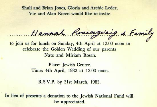 הזמנה לחתונת הזהב של יונתן ומרים רוזין,1982 |