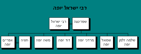 רבי דוד יפה ורבי שלמה-זלמן יפה, בניו של רבי ישראל יפה עלו לארץ ישראל בשנת 1777, יחד עם רבם מנחם-מנדל מויטבסק וכ-300 חסידים נוספים. רבי דוד יפה התיישב בטבריה, ובשנת 1806 נשלח ע"י העדה הספרדית שבטבריה כשד"ר לצפון אפריקה. רבי שלמה זלמן יפה התגורר בצפת, ונספה בה ברעידת האדמה בשנת 1837. בן שלישי של רבי ישראל יפה, אהרון-משה יפה עלה ארצה בשנים הראשונות של המאה ה-19 יחד עם אישתו: הרבנית פייגה, והתיישב בחברון. כשעלו לישראל, עקב סערה בים לא יכלו לעגון בחופי ארץ ישראל, ולכן עגנו במצרים ורכבו לארץ ישראל על גבי גמלים. לאחר פטירת ה'אדמו"ר הזקן',ציווה בנו ה'אדמו"ר האמצעי',על רבי ישראל יפה לעלות לארץ ישראל, אשר שלושה מביו כבר היו בה. רבי ישראל יפה, שהיה כבר זקן,עשה כמצוות רבו ועלה לישראל. רבי אפריים יפה, בנו בכורו של רבי ישראל יפה עלה אף הוא לארץ, אך לאחר כשלושים שנה נסע לרוסיה לביקור, חלה ומת בעיר ארשא. לאפריים, בנו של רבי ישראל יופה, היו שלושה בנים: צבי-הירש,אברהם וישראל. צבי-הירש, אשר נולד בחברון בשנת 1842, נישא לרייזל, ולהם נולדו חמישה ילדים: אהרון , אסתר , אפריים ,גיטל וגרה.